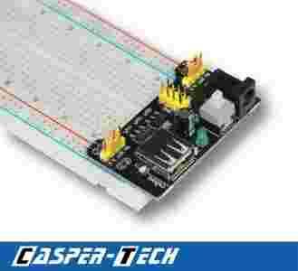 Nowa zasilacz płytki prototypowej stykowej 830 polowej. Moduł posiada wejście USB oraz zewnętrznego źródła zasilania, włącznik, diodę informującą o pracy, osobne tory zasilania 3,3V lub 5V oraz dodatkowe złącze goldpin z wyprowadzonymi napięciami 3,3 i 5V.