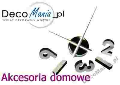 Nowoczesny zegar ścienny. Idealny do wnętrz utrzymanych w nowoczesnym klimacie. Zestaw składa się z mechanizmu z 2 wskazówkami montowanym na hak/kołek, cyfr: 1, 2 (lub 12), 3, 6, 9; 8 kreseczek przyklejanych do podłoża, instrukcji montażu oraz rysunku pomocnego w odpowiednim rozmieszczeniu cyfr.