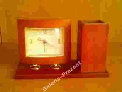 Ekskluzywny zegar na biurko z miejscem na artykuły piśmienne.
