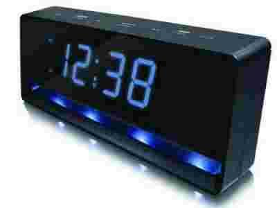 w budzik z funkcją drzemki, posiada duży i czytelny wyświetlacz w kolorze niebieskim którego intensywność świecenia można dostosować
