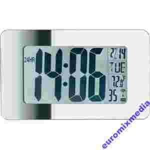 Zegar ścienny z dużym wyświetlaczem i ramką ze szkła lustrzanego. Niezwykła rama ze szkła lustrzanego z zaokrąglonymi rogami idealnie na każdą ścianę. Na wyświetlaczu już na pierwszy rzut oka można zobaczyć wszystkie najważniejsze informacje. Obok godziny wyświetlana jest data z dniem tygodnia oraz temperatura wewnątrz. A jeśli nie mają Państwo akurat wolnej ściany, zegar lustrzany można ustawić za pomocą otwieranej podstawki na stole lub komodzie.