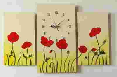 Tryptyk wykonany na płytach HDF o grubości 3 mm, wymiary części środkowej z zegarem wynoszą 25x45 cm, boczne części tryptyku 20x35 cm ( całość o szerokości 65 cm i wysokości 45 cm). Malowany farbami akrylowymi.