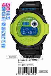 Casio G-Shock G-001 to zegarek z mechanizmem kwarcowym zasilany baterią. System antywstrząsowy sprawia, że żywotność zegarka jest znacznie dłuższa. Ma możliwość jednoczesnego pomiaru czasu w wielu różnych strefach czasowych na podstawie danych największych miast na świecie. Podświetlenie Auto równomiernie oświetla tarczę, automatycznie włącza się podczas ruchu nadgarstka w kierunku twarzy. Zegarek posiada stoper i timer odmierzający czas wstecz, mineralne szkiełko, pasek wykonany z tworzywa sztucznego, trzy alarm, a także funkcję drzemki / opóźnienie alarmu, 12 jak i 24 godzinny tryb wyświetlania godziny.