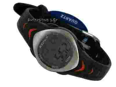 Koperta w kolorze czarnym z metalową wstawką . Wyświetlacz dobrze czytelny , duże cyfry, podświetlany w kolorze morskim . Pasek również w kolorze czarnym , z czerwonymi akcentami , wykonany z wysokiej jakości tworzywa syntetycznego .