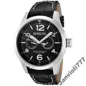 Brand Name: Invicta Model number: 0764 Part Number: 0764 Item Shape: round Dial window material type: flame-fusion Display Type: analog Clasp: Buckle Case material: stainless-steel Case diameter: 48 millimeters Case Thickness: 13 millimeters Band material: Leather Band length: mens-standard Band width: 24 millimeters Band Color: black Dial color: black Bezel material: stainless-steel Bezel Function: stationary Calendar: day-and-date Movement: swiss-quartz Water resistant depth: 330 Feet