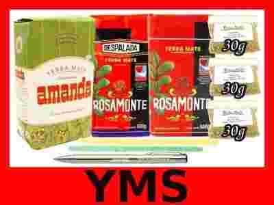 Idealny zestaw dla smakosza yerba mate. W zestawie znajduje się 3x po 500g najlepszych yerba mate: Amanda ziołowa, Rosamonte despalada i Rosamonte elaborada oraz na spróbowanie 3x 30g losowo wybranych yerba mate, firmowy długopis z logo i 2 wyciorki do czyszczenia bombilli.