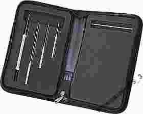 INOX - ze stali nierdzewnej. W komplecie 4 wiertła/igły wraz z portfelem na zestawy.