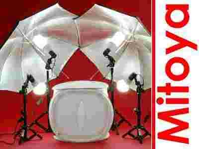 Zestaw studyjny do fotografii bezcieniowej oparty o namiot bezcieniowy sześcian 40cm, dwa statywy 39cm, dwa statywy 76cm i żarówki światła stałego 36W i 65W oraz dwie parasolki srebrne 110cm.