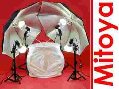 Zestaw studyjny do fotografii bezcieniowej oparty o namiot bezcieniowy sześcian 40cm, dwa statywy 39cm, dwa statywy 76cm i żarówki światła stałego 36W oraz dwie parasolki srebrne o średnicy 110cm.