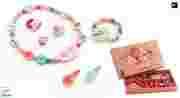 Zestaw drewnianej biżuterii.Każda z części biżuterii jest zapakowana w oddzielną bibułkę i leży w oddzielnej przegródce.