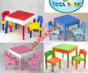 POMARAŃCZOWO-ZIELONY MULTIKOLOR Wspaniały zestaw mebelków dla każdego malucha, stolik + dwa krzesełka. Stolik charakteryzuje się dużą wielofunkcyjnością. Może być zwykłym stolikiem, lecz po odwróceniu pokrywy staje się planszą do klocków lego. Po całkowitym zdjęciu blatu może służyć jako piaskownica, lub mini pojemnik na wodne zabawy. Pojemnik pod blatem ma 10 cm głębokości. Idealny zestaw dla Dzieci, które zaczynają malować, rysować, przeglądać książki, bawić się klockami lub urządzać małe przyjęcia dla lalek. Zestaw doskonale nadaje się na zimowe wieczory w domu jak i letnie popołudnia w ogrodzie. Zestaw mebelków jest bardzo bezpieczny dla każdego maluszka. Firma Tega solidnie wykonała przedmiot z wygładzonymi i zaokrąglonymi krawędziami, produkt wykonany jest z atestowanych materiałów. Zestaw bardzo łatwo można oczyścić przecierając wilgotną szmatką.