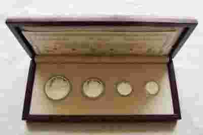 MONETY WRAZ Z CERTYFIKATEM UMIESZCZONE SĄ W ŁADNYM DREWNIANYM PUDEŁKU W KOLORZE MAHOŃ OZDOBIONYM MEDALEM MENNICY.