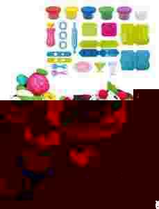 Zestaw zawiera 24 elementów - 6 kubki z ciasto-masą, 2 różne wieloelementowe foremki, 4 x foremki do wyciskania 2 x pucharki na lody, 1 x talerzyk, wałeczek, 1 x przyrząd do wycinania wzorów, łyżeczka, widelczyk, wałeczek, wyciskarka, 2 x płaskie nakładki na wyciskarkę, 3 x wzorzyste nakładki na wyciskarkę.