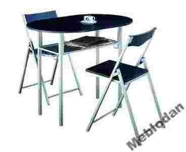 W skład zestawu wchodzi stół i 2 krzesła w kolorze czarnym, metal w kolorze aluminium.