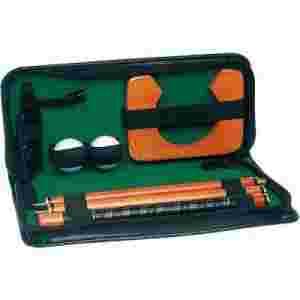 Zestaw zawiera skręcany kij golfowy, dwie piłeczki golfowe, oraz drewniany stelaż imitujący "dołek". Wszystko zapakowane w eleganckie, skórzane etui o wymiarach - 310x154x50 mm.