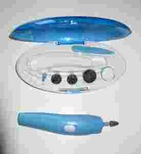 W skład zestawu wchodzi 8 elementów: frezarka/szlifierka do kosmetycznego manicure i pielęgnacji stóp oraz 7 nasadek i pałeczka do skórek. Wśród wymiennych nasadek znajdują się: