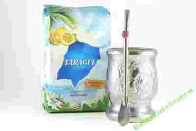 W skład zestawu wchodzą: przecudnie grawerowane Palo Santo z motywem kwiatu i dopasowana srebrna bombilla i Taragui Marakuja 500g.
