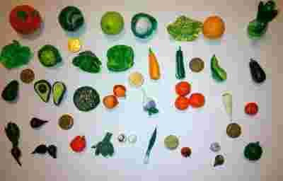 Zestaw składa się z 40 sztuk różnego rodzaju owoców i warzyw-