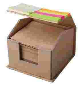 Pomysłowo zaprojektowany komplet karteczek memo. W kartonowym domku wykonanym z surowców wtórnych znajduje się blok makulaturowych karteczek do notowania, a na jego dachu zestaw kolorowych samoprzylepnych karteczek.