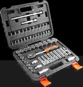 Klucze nasadowe 58 szt., 1/2, stal CrV, nasadki dwunastokątne 1/2 17 szt.: 10, 11, 12, 13, 14, 15, 16, 17, 18, 19, 20, 21, 22, 24, 27, 30, 32 mm, nasadki długie sześciokątne 1/2 8 szt.: 10, 11, 12, 13, 14, 15, 17, 19 mm , grzechotka 1/2, 45 zębów, przedłużki 1/2 2 szt.: 5' i 10', pokrętło przelotowe typu T 1/2, nasadki do świec 1/2 2 szt.: 16 mm i 21 mm, adapter bitów 1/2 na 5, 16, przedłużka uniwersalna 1/2, bity 5, 16 25 szt.: T20, T25, T30, T40, T45, T50, T55, H4, H5, H6, H8, H10, H12, H14 mm, PH1, PH2, PH3, PH4, PZ1, PZ2, PZ3, PZ4, PL 8, 10, 12 mm.