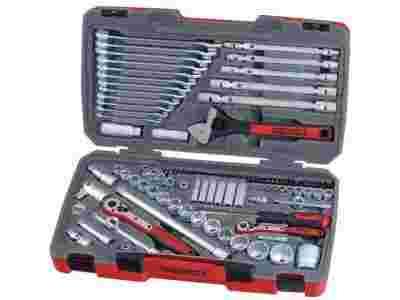 "Teng Tools" Zestaw narzędzi składający się ze 106 elementów. Zawiera nasadki sześciokątne krótkie ¼" i 3/8", nasadki sześciokątne długie ¼", nasadki do świec zapłonowych 3/8", nasadki dwunastokątne krótkie ½", pokrętła zapadkowe, przeguby uniwersalne, przedłużniki, nasadki do osadzania grotów, przedłużniki, klucz bi-flex, wkrętak na groty wymienne, łączniki pośrednie, klucze przegubowe dwustronne, klucze płasko-oczkowe, pierścień do zawieszania kluczy płasko-oczkowych, klucz nastawny i groty wkrętakowe ¼" - długość 25 mm.
