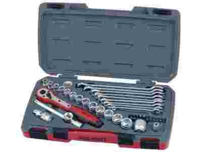 "Teng Tools" Zestaw kluczy nasadowych/płasko-oczkowych składający się z 40 elementów. Zawiera 14 nasadek sześciokątnych. Ponadto zawiera przedłużnik 150 mm, przegub uniwersalny, nasadkę pod groty ¼", łącznik redukcyjny ½"-3/8", pokrętło zapadkowe zbrojone włóknem szklanym - dwukierunkowe, oraz 9 kluczy płasko-oczkowych i 11 grotów wkrętakowych.