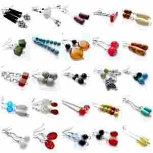 Kolczyki wykonane są z różnorodnych materiałów takich jak: szkło, drewno, szkło crackle, akryl, cekiny, masa perłowa, muszla, elementy metalowe, posrebrzane itp.