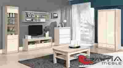 System mebli Axel to nowoczesne kształty, które w połączeniu ze szklanymi półkami w witrynach i podświetleniu LED, nadadzą każdemu pomieszczeniu lekkiej awangardy. Ponadto meble zostały wykonane w niepowtarzalnym połączeniu kolorystycznym, gdzie korpusy w kolorze tuja/dąb latte uzupełnia jasny kolor frontu jaśmin połysk.