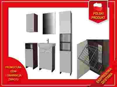INNE: metalowe zawiasy z możliwością regulacji, uchwyty PCV dwupunktowe. Szafka wysoka posiada w dolnej części kosz na bieliznę , niska i wisząca posiada po jednej półce w środku. Lustro na płycie. Szafki są do samodzielnego montażu. Umywalka ceramiczna. Szafki można zakupić też pojedynczo - dostępne na innych naszych aukcjach, jak też baterie , syfony i korki klik-klak. KUPUJESZ U PRODUCENTA