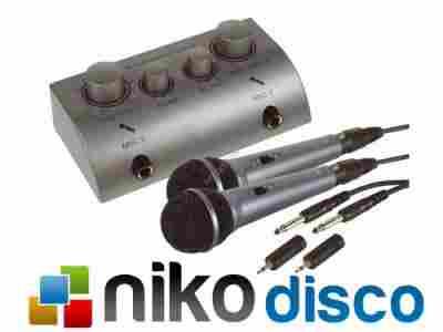 Super zestaw do amatorskiego karaoke zawierający dwa dynamiczne mikrofony i mikser z możliwością ustawienia pogłosu.