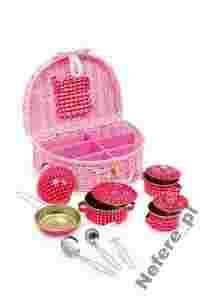 Całość zapakowana w estetyczny zapinany koszyk, w którym wszystkie elementy mają swoje miejsce. Garnki wykonane z metalu dzięki czemu są bezpieczne i nic sie nie potłucze. Elementy w czerwonym kolorze z białymi serduszkami.