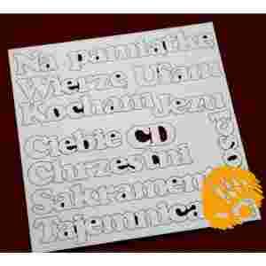 - na arkuszu znajduje się 11 napisów: Na pamiątkę, Wierzę, Ufam, Jezu, Ciebie, CD, Chrzestni, Sakrament, Tajemnica, Miłości,
