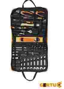 Zestaw narzędzi składający się z 98 elementów: - 1 szt. 6" szczypiec długich - 1 szt. 7" obcęg - 1 szt. 1/4" obrotowego uchwytu - 4 szt. śrubokrętów: SL6*100, PH2*100, SL6*38, PH2*38 - 1 szt. 300 g młotka - 16 szt. kluczy imbusowych - 2 szt. uchwytu z mechanizmem zapadkowym 1/4" & 3/8" - 1 szt. miarki 3 m*12.5 mm - 1 szt. miernika upływu prądu - 9 szt. 1/4" gniazd: 5, 6, 7, 8, 9, 10, 11, 12, 13 mm - 13 szt. 3/8" gniazd 8, 9, 10, 11, 12, 13, 14, 15, 16, 17, 18, 20, 21 mm - 1 szt. 1/4" przedłużki - 2 szt. 3/8" przedłużki - 2 szt. kluczy nasadkowych do świec 16 mm, 21 mm - 2 szt. ruchomej blokady 1/4" & 3/8" - 2 szt. uniwersalnego łącznika 1/4" & 3/8" - 30 szt. końcówek wkręcających: 25 mm, materiał CR-V - 8 szt. kluczy płasko-oczkowych: 8, 9, 10, 11, 12, 13, 14, 15 mm - 1 szt. torby na narzędzia