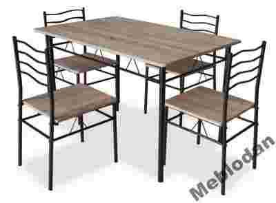 W skład zestawu wchodzi stół i 4 krzesła w kolorze czarny/dąb sonoma, stół: stelaż metal/czarny + blat wykonany z płyty mdf/dąb sonoma.