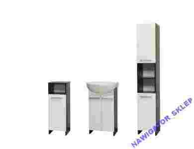 INNE: metalowe zawiasy z możliwością regulacji, uchwyty PCV dwupunktowe. Szafka wysoka , niska i wisząca posiada po jednej półce w środku. Szafki są do samodzielnego montażu, uniwersalne - prawe / lewe zależnie od zmontowania. Umywalka ceramiczna. Szafki można zakupić też pojedynczo - dostępne na innych naszych aukcjach, jak też baterie , syfony i korki klik-klak.