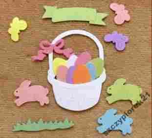 Koszyczek, króliczki, motylki, kokardka, baner posiadają nacięcia, pomocne przy malowaniu, można też wyciąć dany fragment i zastąpić go w innym kolorze, bądź też podkleić innym papierem.