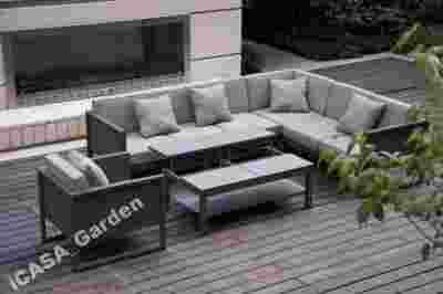 pięcioelementowy zestaw, który idealnie uzupełni ogród, przestronny taras czy restaurację. Aluminiowa konstrukcja na wysokich nóżkach, a także szary pastelowy, neutralny kolor stelaża i obić nadają całości niezwykłej lekkości i sprawiają, że meble te wpasują się w każdą przestrzeń.