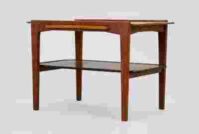 Rewelacyjny zgrabny stolik z lat 70/80 - tych, wykonany z drewna tekowego oraz fornirowany tekiem, przydatny stolik na każdą okazję, dodatkowo posiada wysuwany blacik. Zachowany w dobrym stanie, z normalnymi śladami użytkowania/czasu.
