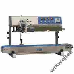 Zgrzewarko – drukarka stałocieplna do zgrzewania ciągłego z taśmociągiem, do zgrzewania worków w pozycji pionowej. Urządzenia te, w odróżnieniu do zwykłych zgrzewarek, mogą obsługiwać kilka woreczków naraz, umożliwiają więc one maksymalne przyspieszenie procesu pakowania oraz znakowania Państwa produktów. Maszyna wykonuje zgrzew o szerokości 10 mm za pomocą dwóch listew stałocieplnych. Dodatkowym atutem urządzenia jest praktycznie nieograniczona szerokości woreczka. Bardzo ważne jest również to, iż sterowanie wszystkimi funkcjami maszyny skupione jest na jednym, centralnym panelu sterowniczym, znajdującym się z przodu urządzenia.