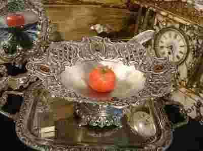 Zapraszam do licytacji zjawiskowo pięknej, dużej patery , na fantastycznie zdobionej , w stylu mauretańskim, podstawie .Cudowny kolor starej cyny,ożywiony jak kroplami słońca, szklanymi imitacjami bursztynu.Patera wykonana jest z metalu nieżelaznego, platerowana cyną.Rzecz jest duża i robi wrażenie na oglądających.Na zdjęciach wygląda znacznie skromniej.Ten przedmiot wspaniale komponuje się z ze stylowymi meblami, mamy również kilka przedmiotów w tym samym stylu, zapraszam do obejrzenia.A jeśli wydaje ci się ,że to jest drogie, to pomyśl ,że za te pieniądze nawet nie zatankujesz do pełna.zapraszam