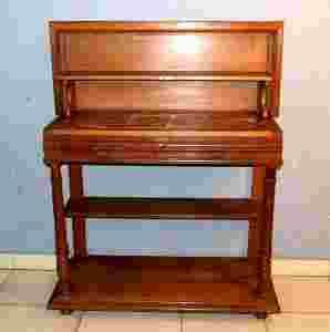 Jest to wspaniały eklektyczny mebel pochodzący z końca XIX wieku. Całość wykonano z drewna orzechowego. Wspaniała sylwetka posiada dwie dolne półki, które można np. wykorzystać na sprzęt hifi i na płyty DVD czy CD. Powyżej znajdująsiędwie szuflady i blat,na którym świetnie prezentuje się np. plazma. Bardzo ciekawym rozwiązaniem jest możliwość otwierania blatu, który kryje dodatkową półeczkę i marmurowy blacik.