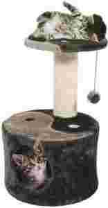 Drapak jest wykonany z wytrzymałego włókna - sizalu, a podstawa i części miękkie są pokryte sztucznym futerkiem.  Świetnym dodatkiem wzbudzającym zainteresowanie kota jest domek-kryjówka i wisząca zabawka.