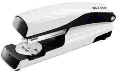 Zszywacz średni metalowy Leitz perłowy.